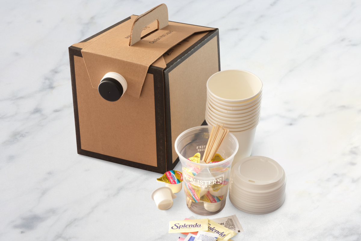 Includes cups, lids, and sweeteners.